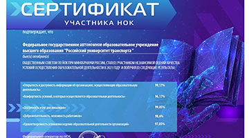 В 2021 г. РУТ (МИИТ) прошел независимую оценку качества (НОК) условий осуществления образовательной деятельности по вопросам инклюзивного образования с высоким результатом. Университет получил Сертификат по критерию «Доступность услуг для инвалидов» с оценкой - 99,85%».