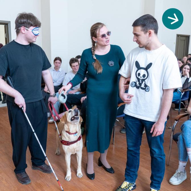 В ИМТК РУТ (МИИТ) прошла встреча студентов с экспертом по созданию доступной среды для людей с инвалидностью и маломобильных граждан. Светланой Телицыной (клуб «Мудрый пес») и собакой-проводником. Участники встречи узнали об особенностях сопровождения людей с нарушением зрения и были приглашены в волонтерский отряд, который будет взаимодействовать с клубом «Мудрый пес» и другими организациями, с целью формирования нравственного отношения к проблемам людей с инвалидностью и возможности принять участие в социальной жизни, проявить доброту и отзывчивость.
